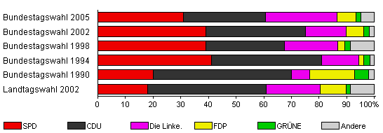 | Bundestagswahl 2005 | 59,3 | 31,0 | 29,7 | 25,9 | 6,7 | 1,9 | 4,8 | |