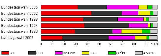 | Bundestagswahl 2005 | 69,4 | 31,4 | 24,9 | 27,4 | 7,9 | 3,9 | 4,5 | |
