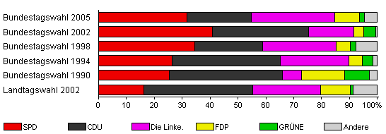 | Bundestagswahl 2005 | 64,3 | 31,8 | 23,0 | 30,0 | 8,8 | 1,8 | 4,6 | |