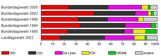 | Bundestagswahl 2005 | 76,4 | 23,8 | 33,8 | 28,8 | 5,6 | 1,9 | 6,3 | |