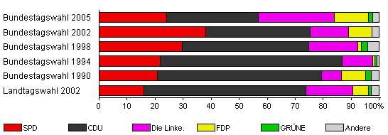 | Landtagswahl 2002 | 64,0 | 15,9 | 57,9 | 16,8 | 5,6 | 0,9 | 2,8 | |