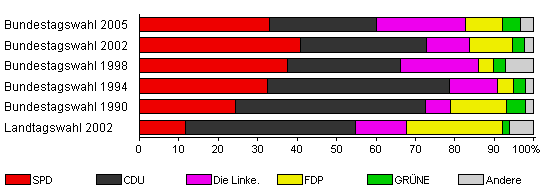 | Bundestagswahl 2002 | 67,0 | 40,8 | 32,0 | 10,8 | 10,9 | 3,2 | 2,3 | |