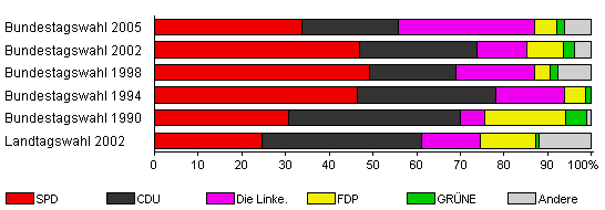 | Bundestagswahl 2005 | 77,0 | 33,7 | 22,1 | 31,3 | 4,9 | 1,8 | 6,1 | |