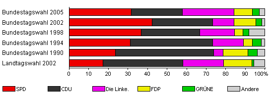| Bundestagswahl 2005 | 59,8 | 31,8 | 26,0 | 26,3 | 9,4 | 3,7 | 2,9 | |