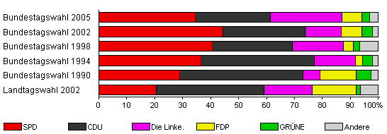 | Landtagswahl 2002 | 56,4 | 20,5 | 38,5 | 17,3 | 15,7 | 1,5 | 6,6 | |
