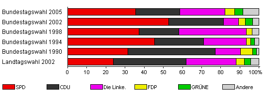 | Bundestagswahl 2005 | 65,6 | 35,6 | 22,9 | 23,7 | 5,1 | 4,2 | 8,5 | |