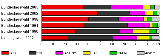 | Bundestagswahl 2005 | 58,7 | 34,9 | 23,9 | 27,4 | 6,3 | 3,3 | 4,1 | |