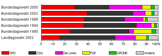 | Landtagswahl 2002 | 54,3 | 16,1 | 46,8 | 17,4 | 9,6 | 1,6 | 8,6 | |