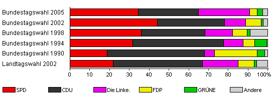 | Bundestagswahl 2002 | 67,4 | 44,1 | 34,1 | 10,6 | 7,8 | 1,1 | 2,2 | |