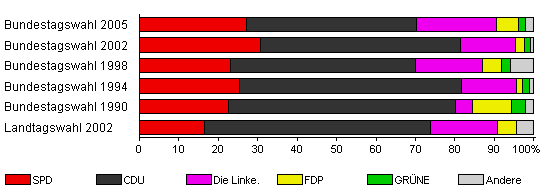 | Bundestagswahl 2005 | 66,5 | 27,2 | 43,1 | 20,3 | 5,4 | 2,0 | 2,0 | |