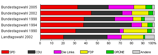 | Bundestagswahl 2005 | 69,5 | 32,6 | 27,0 | 22,2 | 10,6 | 5,6 | 2,0 | |