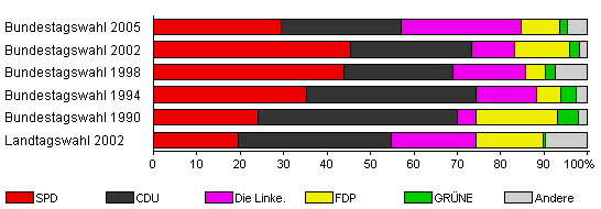 | Landtagswahl 2002 | 48,1 | 19,5 | 35,3 | 19,5 | 15,5 | 0,5 | 9,6 | |