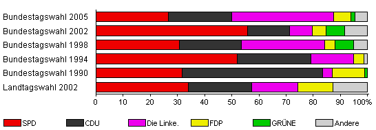 | Bundestagswahl 2005 | 75,3 | 26,6 | 23,4 | 37,5 | 6,3 | 1,6 | 4,7 | |