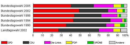 | Landtagswahl 2002 | 52,2 | 27,0 | 42,7 | 15,4 | 7,7 | 0,3 | 6,8 | |