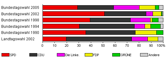 | Bundestagswahl 2005 | 80,7 | 29,0 | 29,8 | 21,4 | 13,0 | 3,1 | 3,8 | |