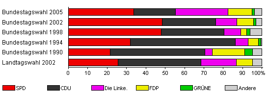 | Landtagswahl 2002 | 41,8 | 25,5 | 42,9 | 18,4 | 8,2 | - | 5,1 | |
