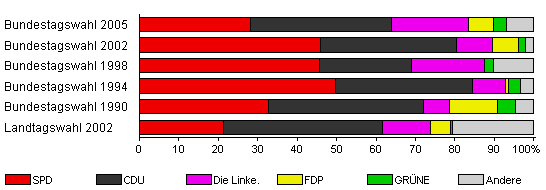 | Bundestagswahl 2005 | 77,0 | 28,2 | 35,6 | 19,7 | 6,4 | 3,2 | 6,9 | |