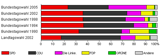 | Landtagswahl 2002 | 54,9 | 17,3 | 50,8 | 12,8 | 12,3 | 0,6 | 6,1 | |
