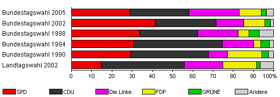 | Landtagswahl 2002 | 65,3 | 14,7 | 41,1 | 19,1 | 16,6 | 1,9 | 6,6 | |