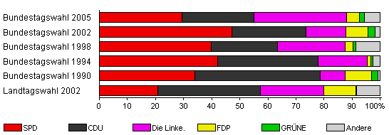 | Bundestagswahl 2002 | 65,7 | 47,1 | 26,4 | 14,2 | 7,9 | 2,5 | 1,9 | |