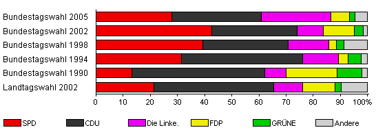 | Bundestagswahl 2002 | 70,4 | 42,7 | 31,3 | 9,8 | 11,4 | 3,3 | 1,6 | |