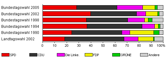 | Bundestagswahl 2005 | 73,5 | 28,2 | 33,5 | 21,2 | 10,2 | 2,0 | 4,9 | |