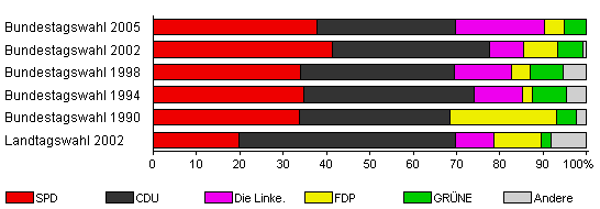 | Bundestagswahl 2002 | 65,0 | 41,4 | 36,2 | 7,8 | 7,8 | 6,0 | 0,9 | |
