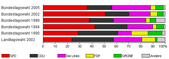 | Bundestagswahl 2005 | 63,0 | 36,1 | 20,2 | 31,6 | 4,1 | 6,5 | 1,5 | |