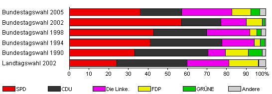 | Landtagswahl 2002 | 54,4 | 24,0 | 35,8 | 21,4 | 14,8 | 0,4 | 3,5 | |