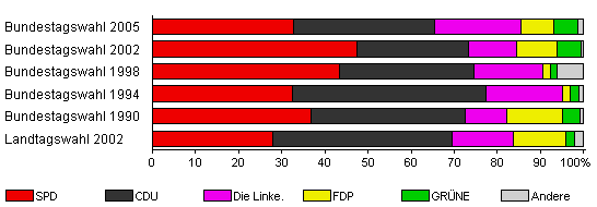 | Bundestagswahl 2002 | 69,2 | 47,5 | 25,7 | 11,2 | 9,5 | 5,6 | 0,6 | |