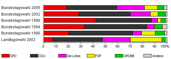 | Landtagswahl 2002 | 76,0 | 7,0 | 40,8 | 22,5 | 25,4 | 2,8 | 1,4 | |