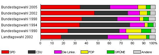 | Bundestagswahl 2005 | 74,9 | 34,4 | 26,0 | 24,2 | 7,2 | 3,9 | 4,3 | |