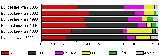 | Bundestagswahl 2002 | 73,9 | 40,7 | 39,3 | 7,6 | 8,6 | 1,7 | 2,1 | |