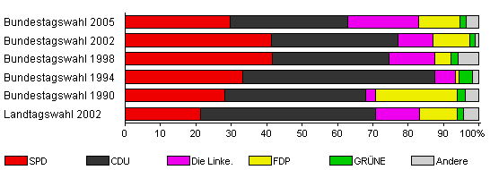 | Bundestagswahl 2005 | 66,9 | 29,7 | 33,3 | 20,0 | 11,5 | 1,8 | 3,6 | |