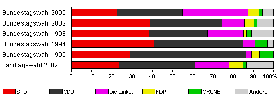 | Bundestagswahl 2005 | 82,0 | 22,5 | 32,4 | 32,4 | 5,6 | 1,4 | 5,6 | |