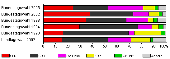 | Landtagswahl 2002 | 50,5 | 15,0 | 37,7 | 18,5 | 16,0 | 1,7 | 11,1 | |