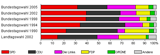 | Bundestagswahl 2005 | 59,2 | 31,8 | 25,4 | 24,6 | 11,4 | 4,0 | 2,8 | |