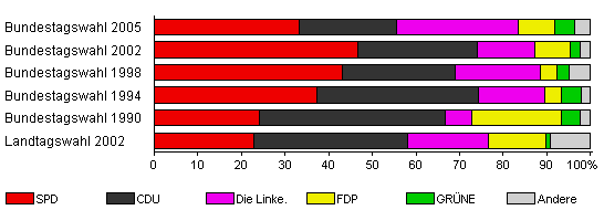 | Landtagswahl 2002 | 45,4 | 22,8 | 35,4 | 18,5 | 13,2 | 1,0 | 9,1 | |