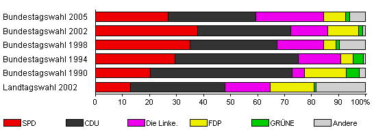 | Bundestagswahl 2005 | 71,2 | 26,9 | 32,5 | 25,0 | 8,2 | 1,5 | 6,0 | |
