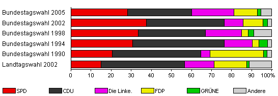| Landtagswahl 2002 | 51,2 | 15,0 | 41,6 | 14,6 | 16,4 | 1,1 | 11,3 | |