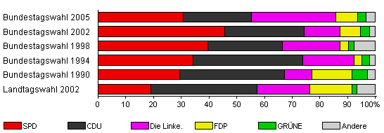 | Bundestagswahl 2002 | 55,9 | 45,7 | 28,7 | 12,8 | 7,5 | 3,2 | 2,2 | |