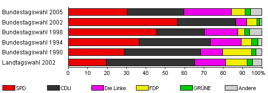 | Bundestagswahl 2002 | 72,3 | 56,3 | 30,2 | 5,5 | 5,5 | 1,3 | 1,3 | |