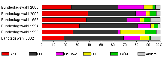 | Bundestagswahl 2005 | 58,4 | 24,8 | 39,3 | 21,8 | 7,6 | 2,3 | 4,2 | |
