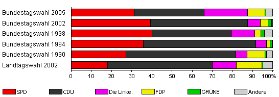 | Landtagswahl 2002 | 53,7 | 18,1 | 51,8 | 12,0 | 12,7 | 0,6 | 4,8 | |