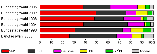 | Landtagswahl 2002 | 55,1 | 25,9 | 41,6 | 13,5 | 8,5 | 1,7 | 8,7 | |