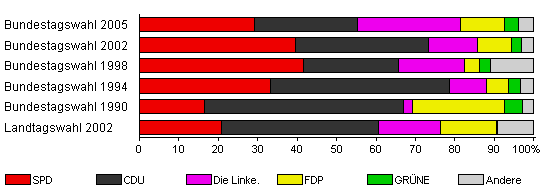 | Bundestagswahl 2005 | 63,2 | 29,2 | 26,0 | 26,3 | 11,0 | 3,5 | 4,0 | |
