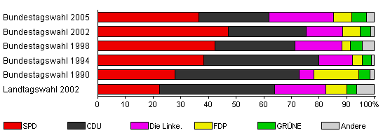 | Bundestagswahl 2005 | 68,9 | 36,5 | 25,4 | 23,4 | 6,4 | 5,4 | 3,0 | |