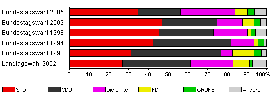| Bundestagswahl 2005 | 64,8 | 34,7 | 21,5 | 27,8 | 6,3 | 3,5 | 6,1 | |