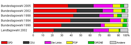 | Bundestagswahl 2002 | 73,0 | 45,8 | 27,3 | 11,1 | 9,0 | 3,7 | 3,1 | |