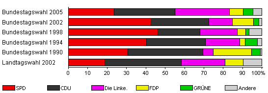 | Bundestagswahl 2005 | 73,8 | 23,5 | 31,5 | 28,2 | 7,1 | 5,0 | 4,6 | |